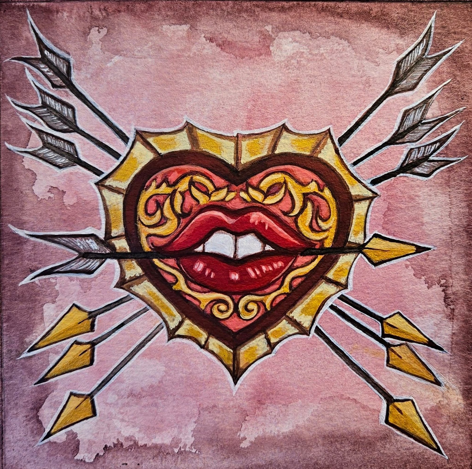Love with pick its teeth with those arrows. Classic Heart run through with arrows. Vintage look good for Valentines Day or any day. 5x5" on heavy water color paper.
